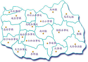 - 鎮(zhèn):張鎮(zhèn)、大孫各莊鎮(zhèn)、北務(wù)鎮(zhèn)、李遂鎮(zhèn)、木林鎮(zhèn)、南彩鎮(zhèn)、北小營鎮(zhèn)、李橋鎮(zhèn)、高麗營鎮(zhèn)、趙全營鎮(zhèn)、北石槽鎮(zhèn)、龍灣屯鎮(zhèn)。
